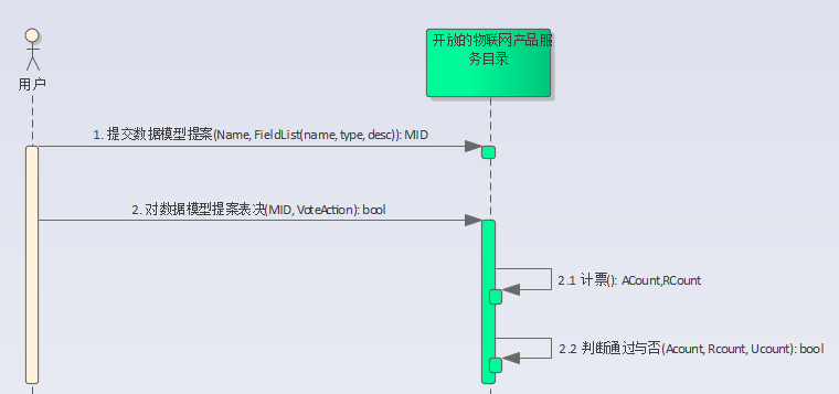 用户提交产品服务描述数据模型:描述特定物联网产品服务的数据模板,发起投票,被半数活跃用户通过,即可作为可被引用的数据模型。新的数据模型可以引用投票通过的数据模型。
